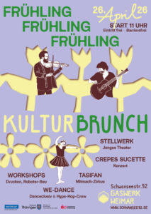 Wir freuen uns euch beim Frühlings-Kulturbrunch zu sehen: Kommt vorbei zu Tanz, Theater, Leckereien, Musik, Basteln und Spielen. Liebe Grüße, Euer Gaswerk-Team!